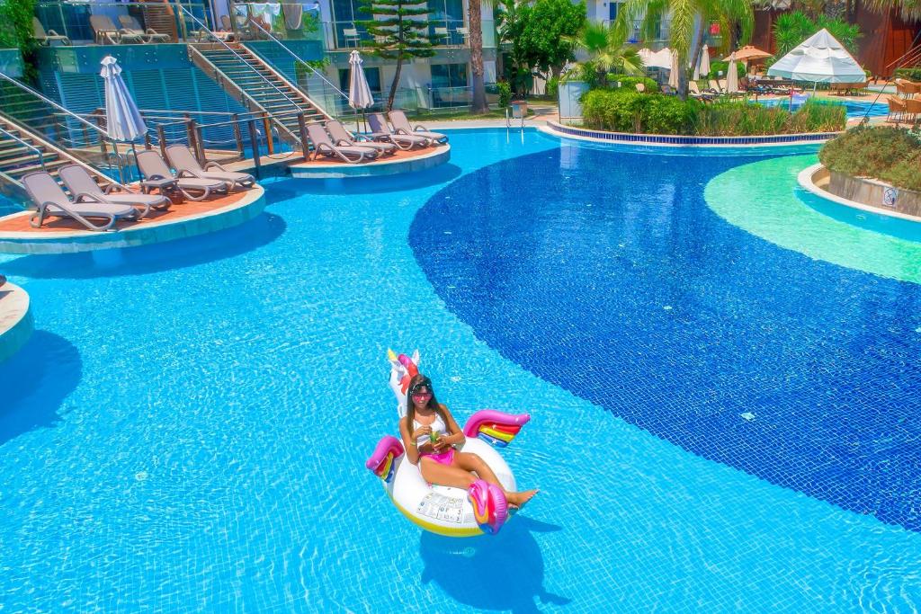 Dette fantastiske anlegget ligger i Alanya, en populær badeby i Antalya-provinsen ved Middelhavet i Tyrkia.Dette familievennlige anlegget er et ideelt valg for gjester som ønsker en komplett ferieopplevelse og tilgang til en rekke attraksjoner, som eget tivoli med radiobiler og pariserhjul, vannland, kino, lekeland, klatrepark og flere bassengområder.